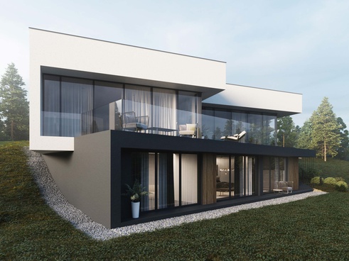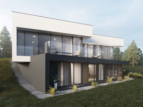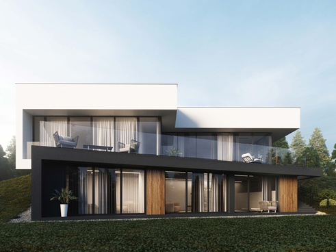 Дом, общей площадью чуть более 300 м2 вписан в довольно крутой склон. Основные помещения сгруппированы на верхнем плато, а нижний уровень отдан для гостевых спален. Дом на стадии реализации.