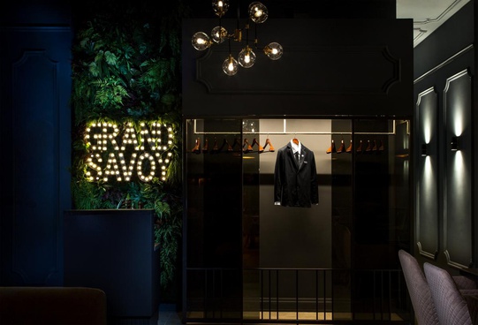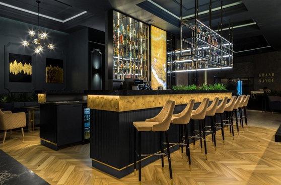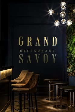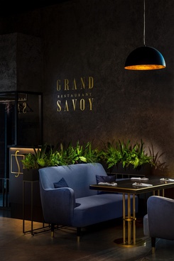 Гипсовые детали, глубокий, сложный оттенок кобальта и латунные аксессуары создают образ интеллигентного, люксового, пространства, под стать общему настроению интерьера отеля «Атриум», на постояльцев которого ресторан ориентирован.
