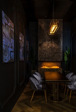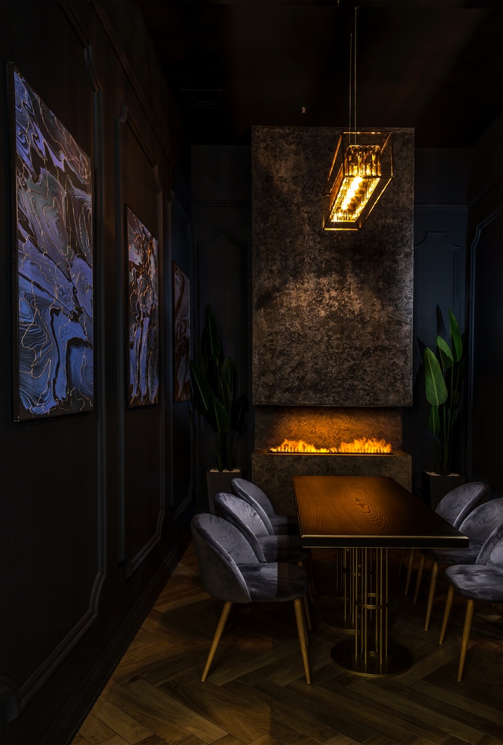 Концепт ресторана разрабатывался совместно с директором ресторана Александром Мироновым, профессионалом своего дела с тонкой настройкой на изящные детали. Сложную инженерию корректировали в процессе проектирования, вырисовывая гармоничные кессоны с подсветкой, главный архитектурный элемент интерьера.