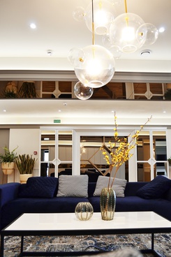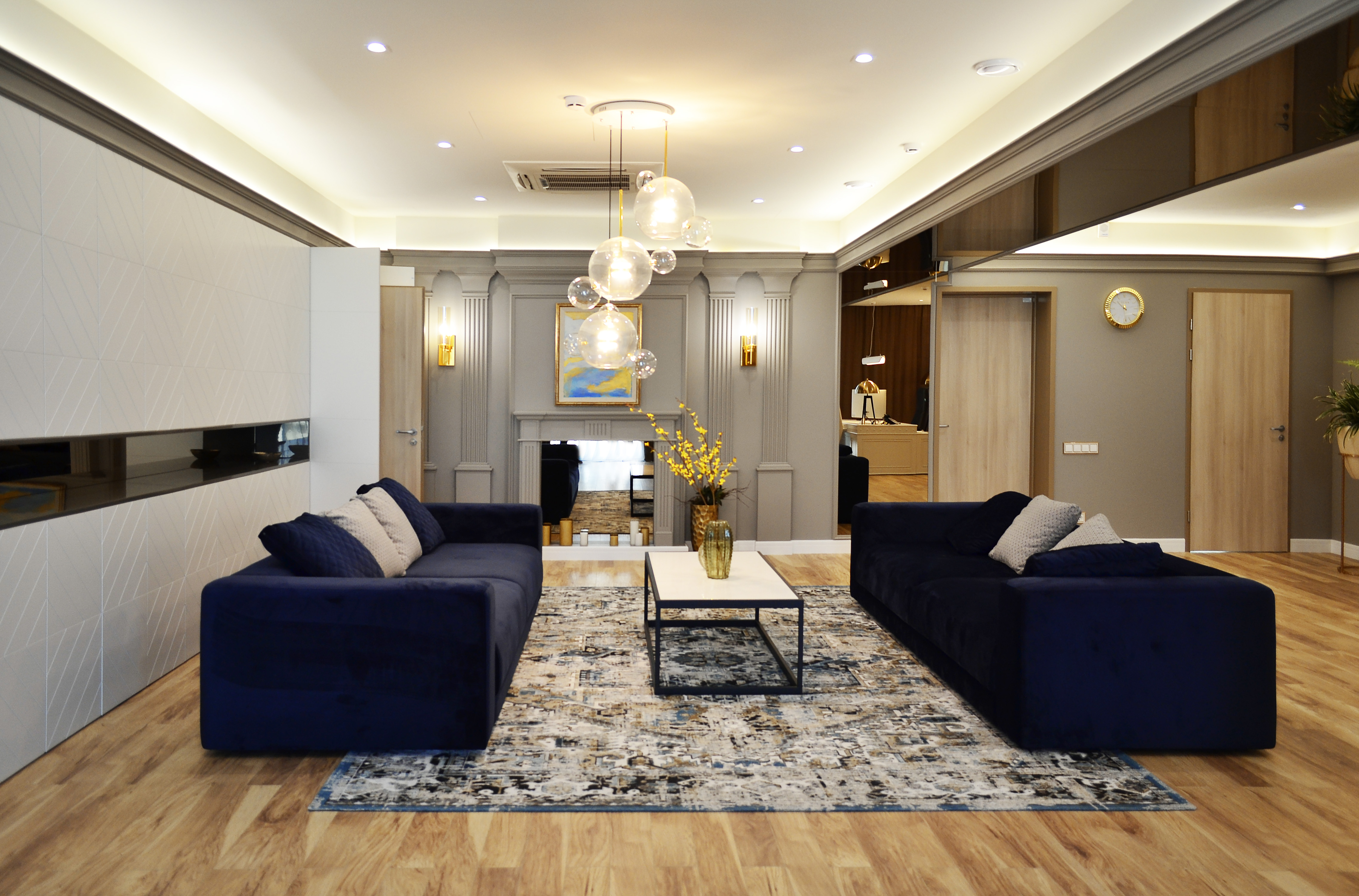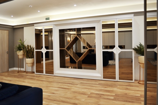 Патинированное стекло прекрасно обыгрывает конструктивную данность пространства, а гипсовые элементы гармонируют с орнаментальной мебелью.