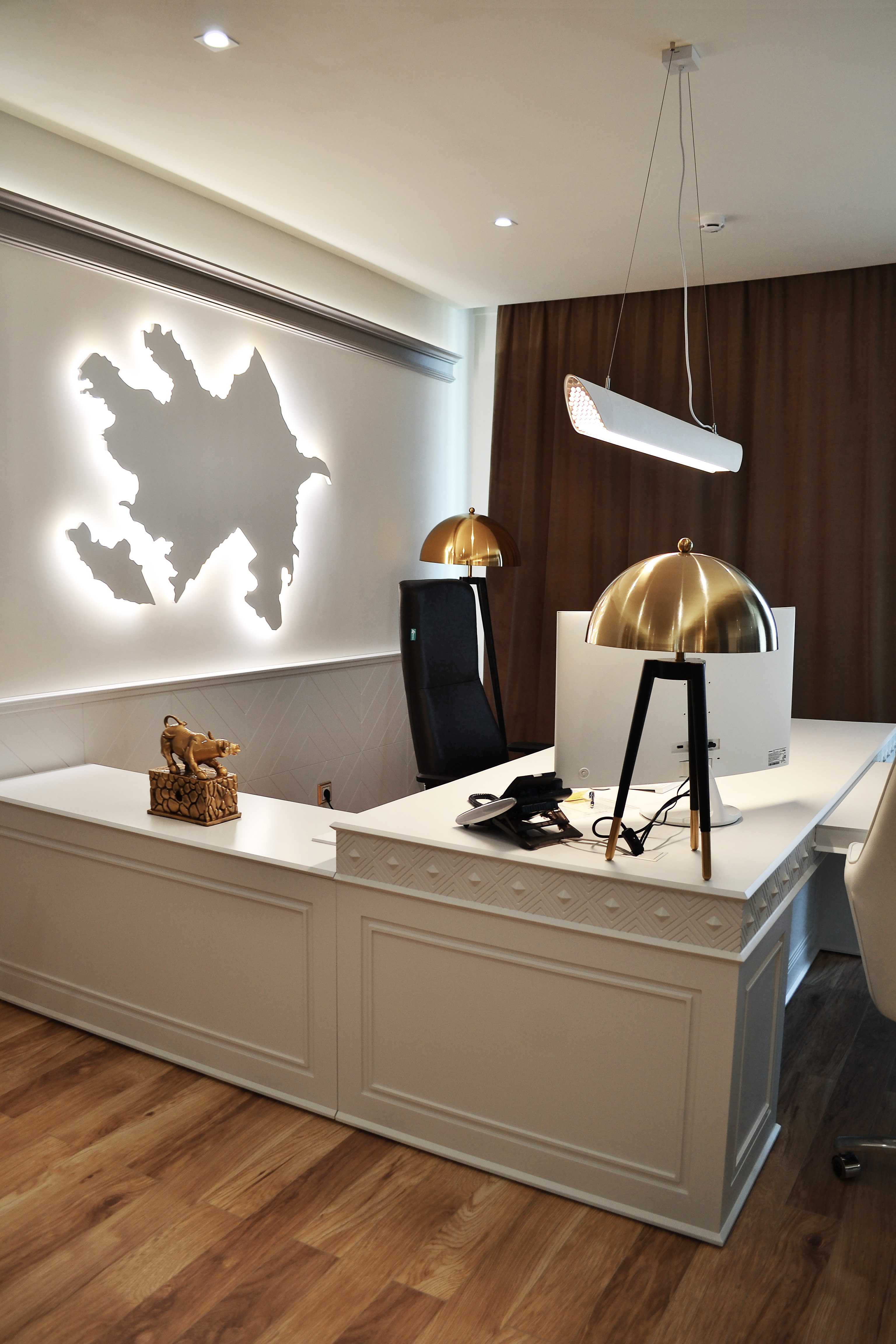 В данном интерьере прослеживается важная часть истории владельца, его восточная национальность. Как и в характере владельца, так и в интерьере, национальные черты и мотивы гармонируют с европейской дипломатичностью.