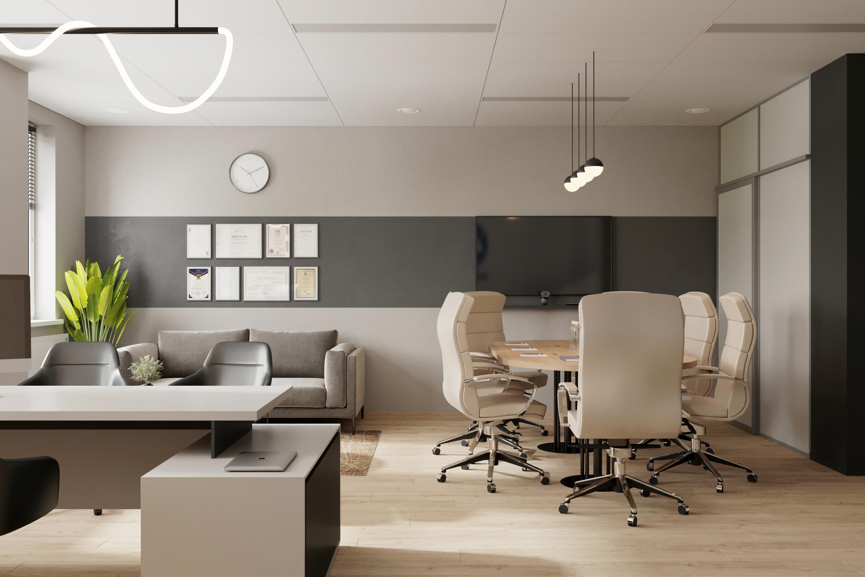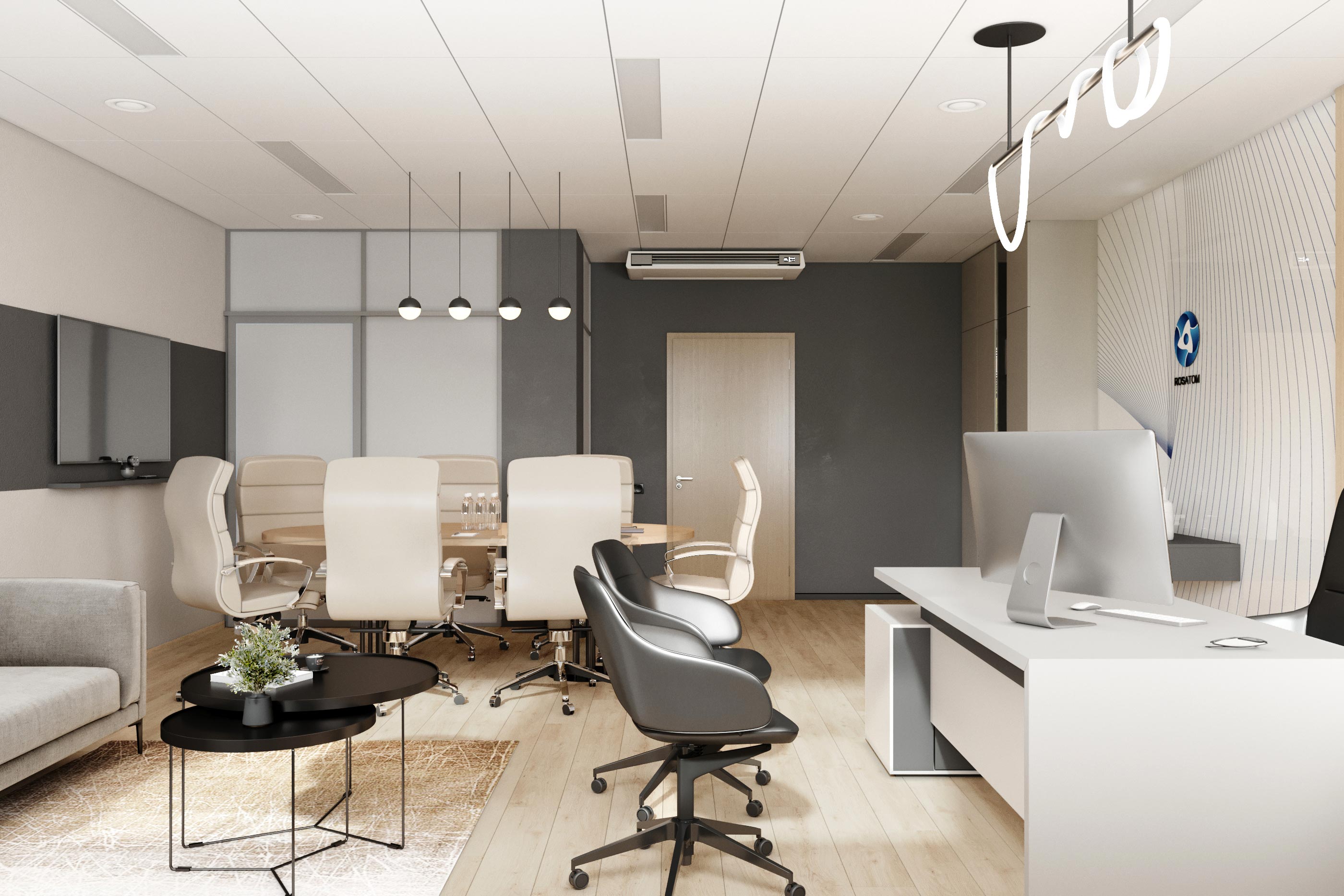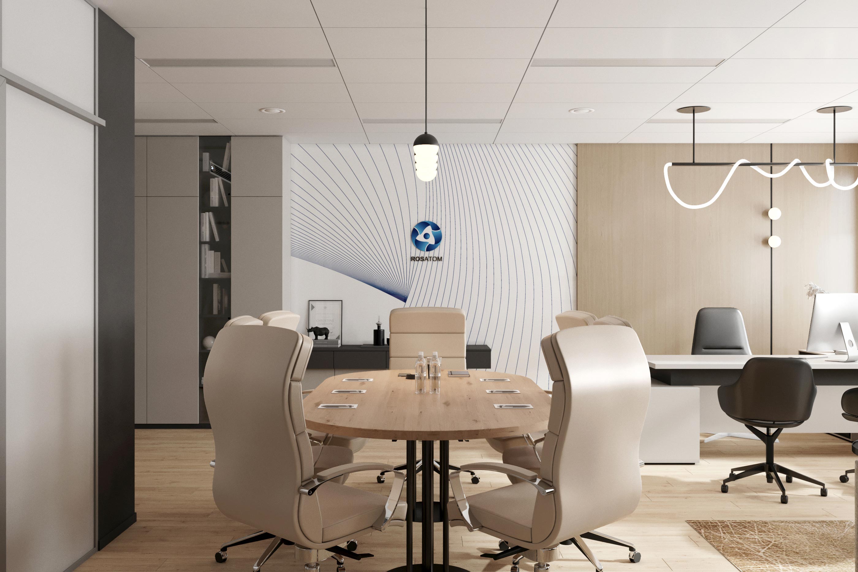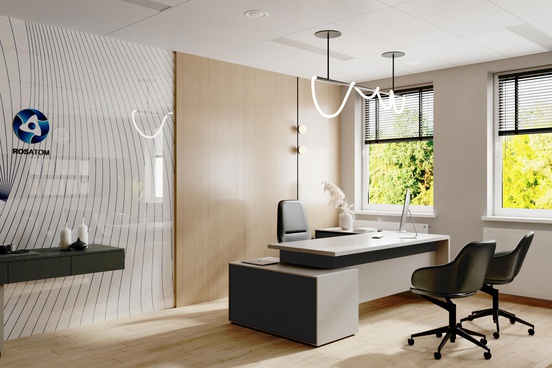 Лёгкий, но серьезный, светлый и свежий, ориентированный на будущее интерьер главы Росатома в Республике Беларусь. Очередной портрет воплощённый в интерьере. На этот раз молодого, амбициозного, лёгкого и быстро развивающего компанию руководителя международной организации.