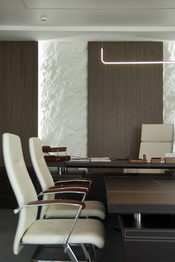 Светлые оттенки стен,штор и потолка с подсветкой -прекрано справились с задачей света в интерьере. Ярким акцентом стал ритм гипсовых скалистых панелей и шпонированных вертикалей. А подсветка добавила этой фактуре натуралистичность и подчеркнула характер руководителя, мощный активный и решительный.